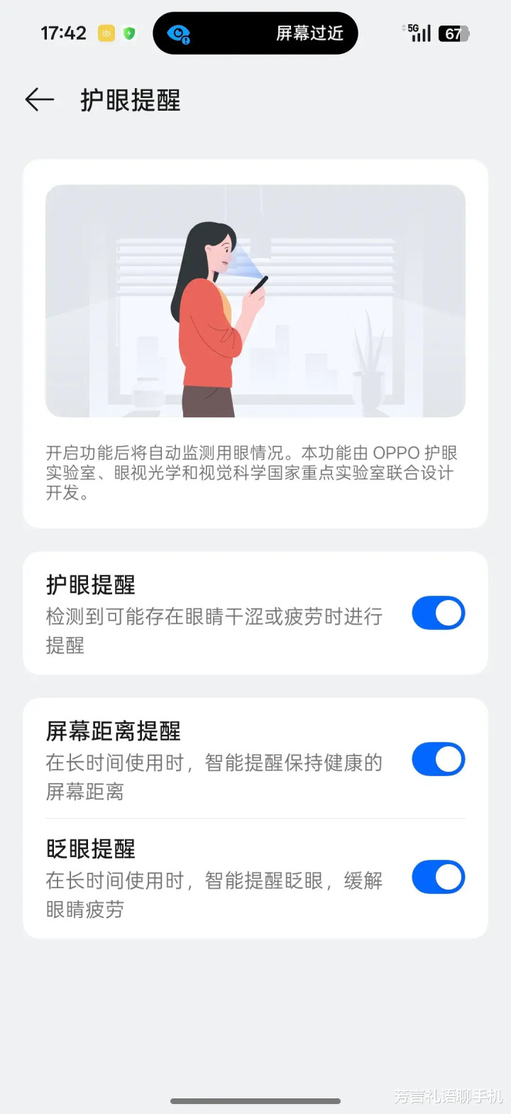 二是AI护眼提醒。开启后,手机将自动监测用眼情况,在眼睛可能存在干涩或疲劳时、长时间使用屏幕时、长时间不眨眼时,就会发出主动提醒,帮助我们注意用眼健康。