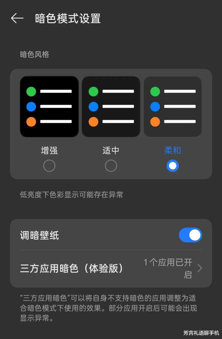 一是暗光显示方面,暗色模式分为三档:增强、适中、柔和,随着暗色的降低,屏幕会加入更多的灰色。用过黑夜模式的应该都有体会,那种黑底白字其实挺刺眼的。相比之下,柔和暗色模式,对比度没有那么强,看起来对眼睛要友好多了。
