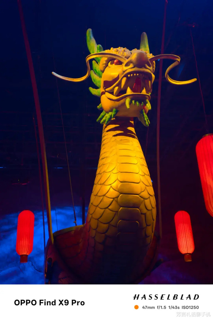 在这种复杂灯光环境下,龙身的金色准确显示。这一点是非常强的,如果是一般的手机,金龙会受周围红色灯笼影响,明显偏红。