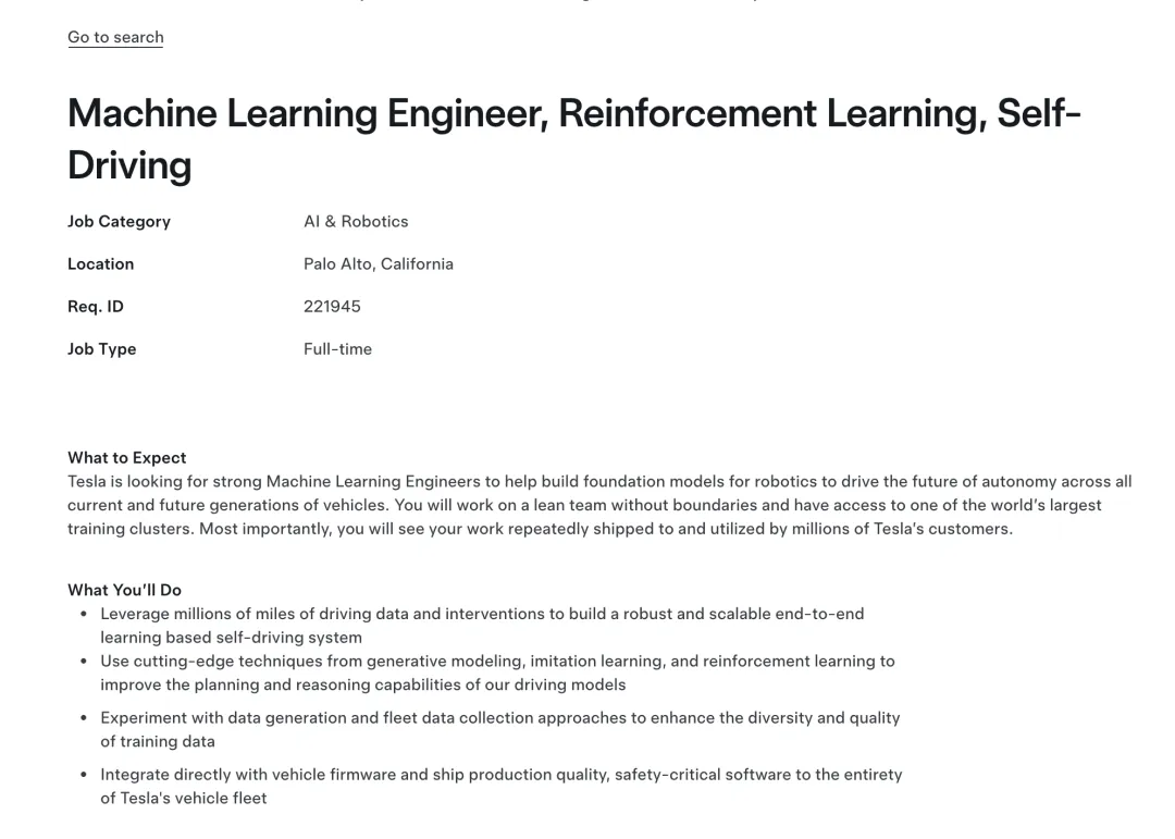 即便马斯克不再对外透露 FSD 的技术路线,但我们仍然可以从特斯拉的招聘启事中一窥端倪。特斯拉最新的招聘启事中明确指出,应聘者需要利用生成建模、模仿学习及强化学习等技术来提升驾驶模型的规划和推理能力。