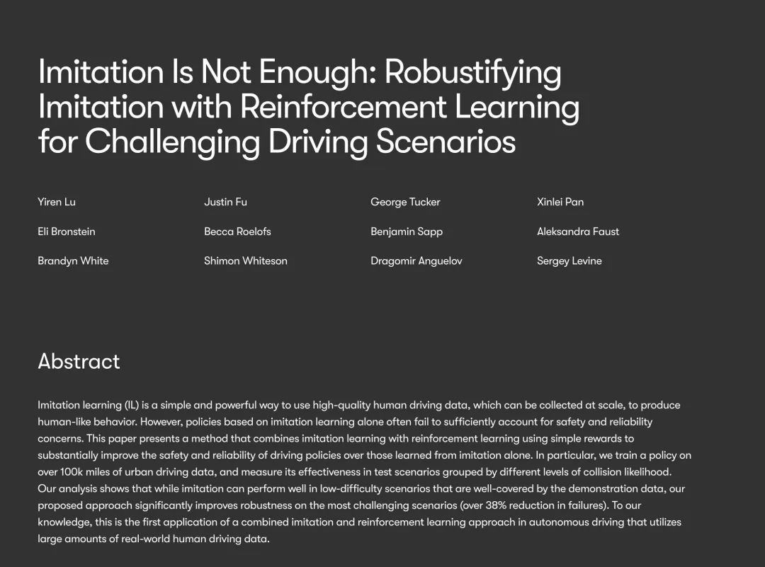 2023 年,谷歌旗下的 Robotaxi 公司 Waymo 对外发布了一篇技术论文,称“模仿远远不够”(Imitation Is Not Enough)。Waymo 表示,仅基于模仿学习的策略往往无法充分解决安全和可靠性问题。他们尝试将模仿学习与强化学习结合,仅仅只通过 10 万英里的城市驾驶数据的训练,就可极大提高最难场景下的安全可靠性,失败率降低超过 38%。