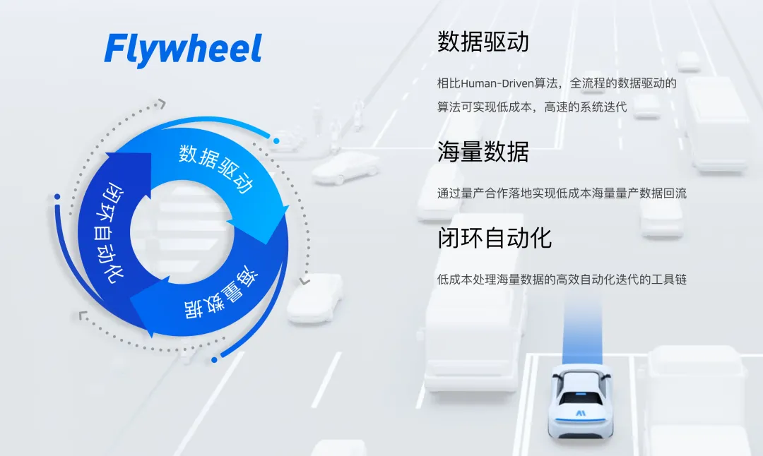 曹旭东认为,如果要实现可规模化的 L4,起码要积累 1000 亿公里的行车数据,这相当于 1000 万台乘用车跑一年。而仅靠自有车队难以实现。他们将这一战略归纳为“一个飞轮两条腿”,“一个飞轮”的核心是数据驱动,两条腿则是 L2 量产与 Robotaxi 共同发力,形成一个高效的数据协同。